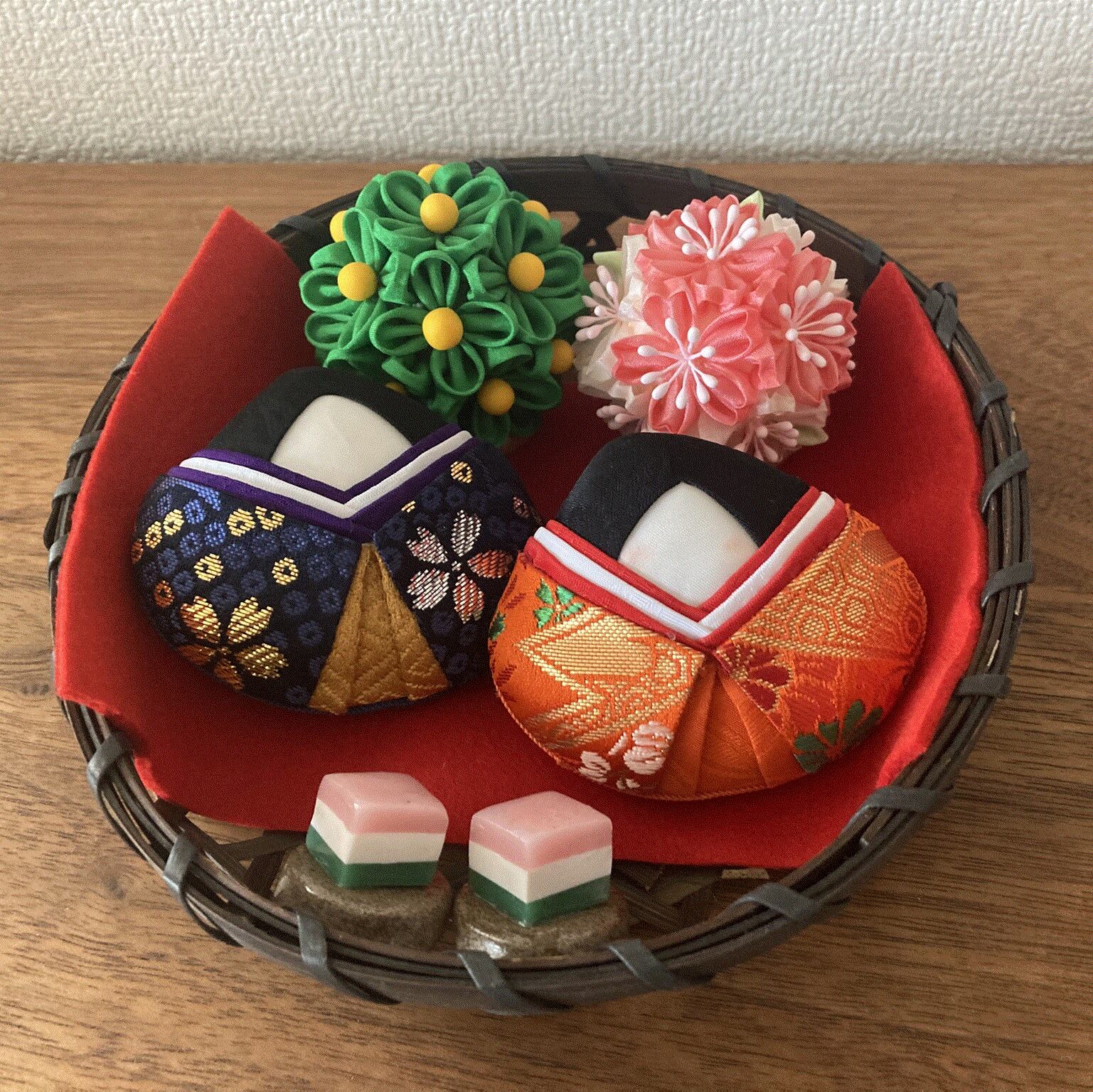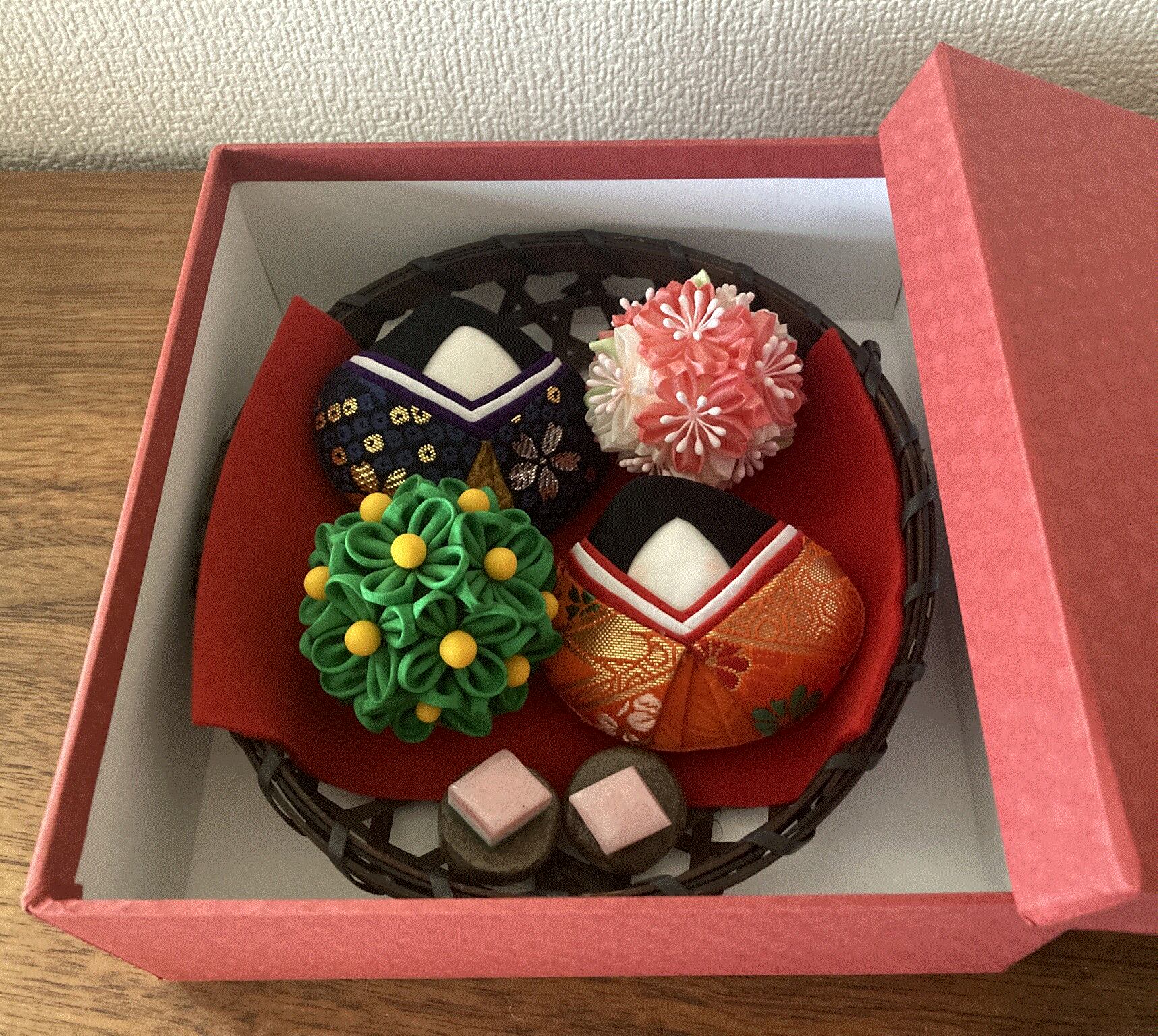 商品内容(お内裏様、お雛様、毛氈、桜橘、ひし餅、籠)